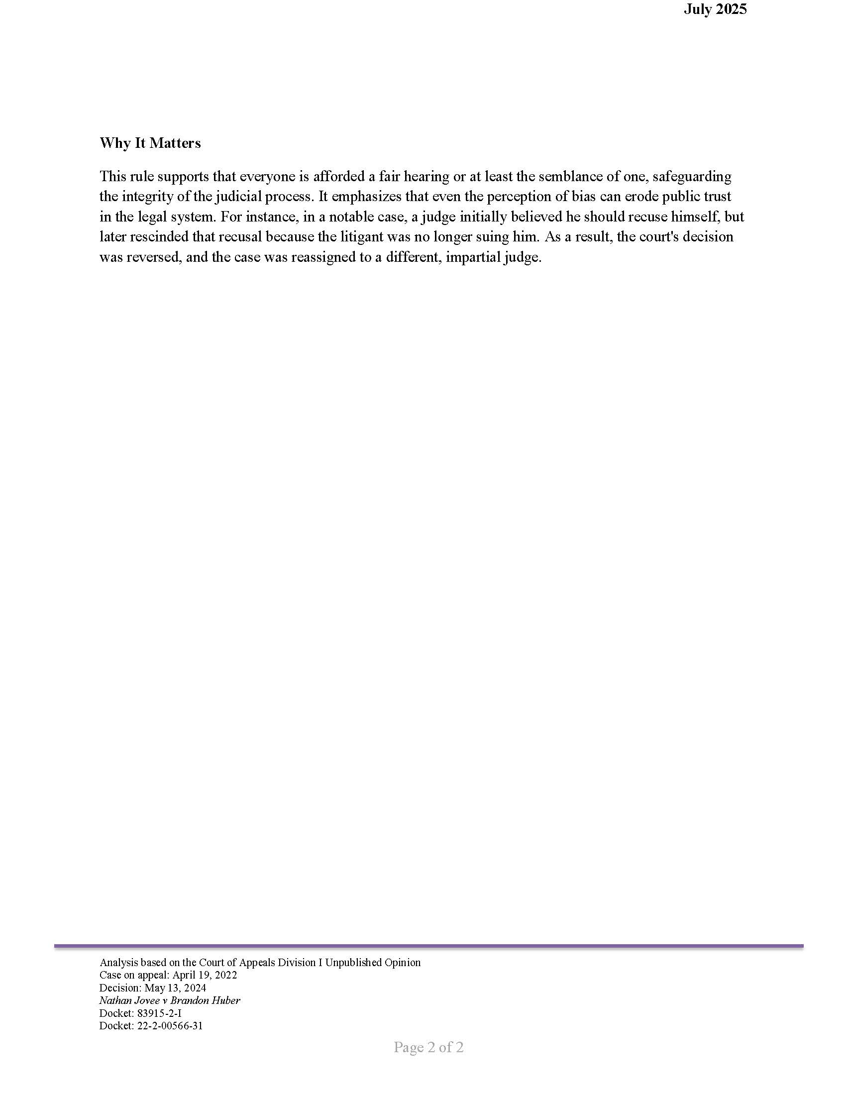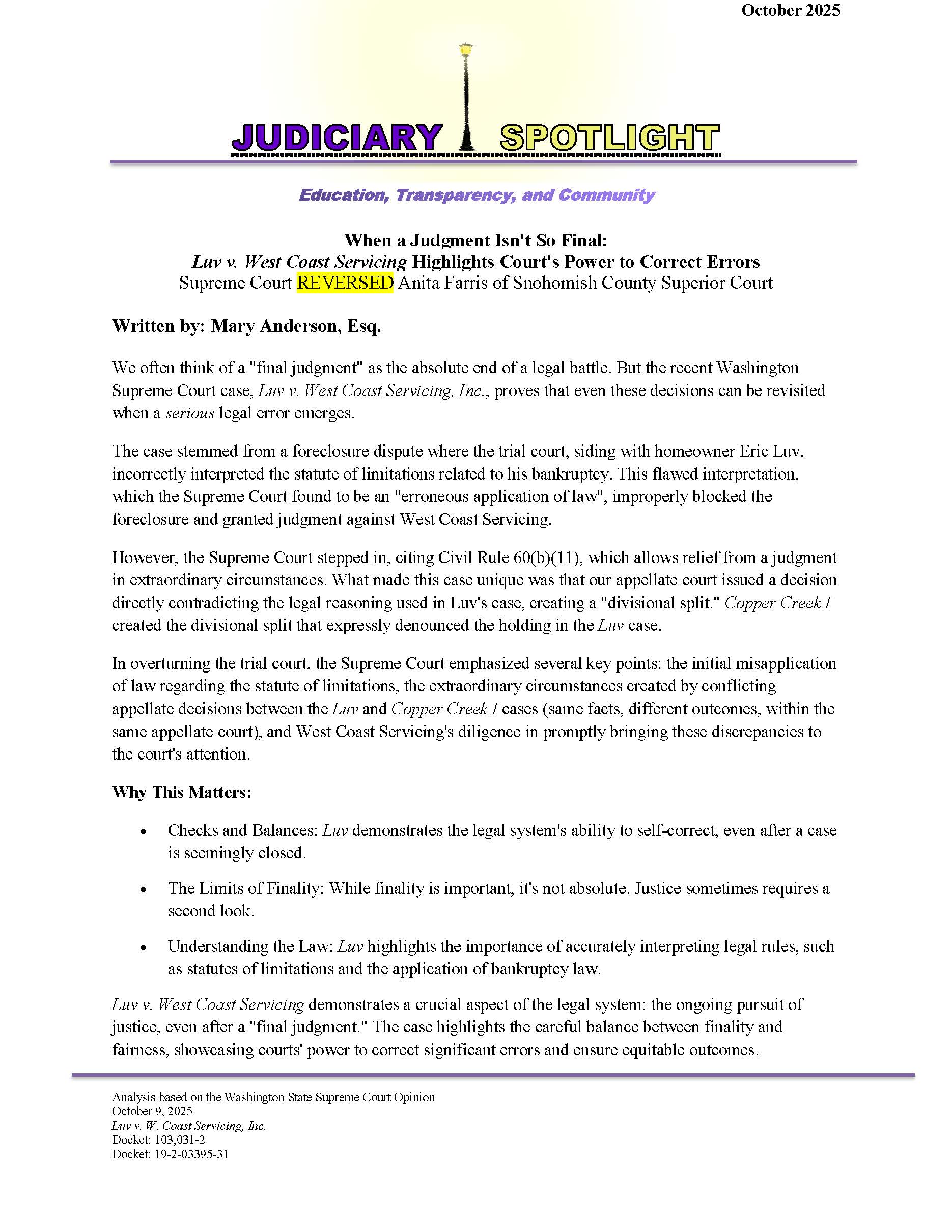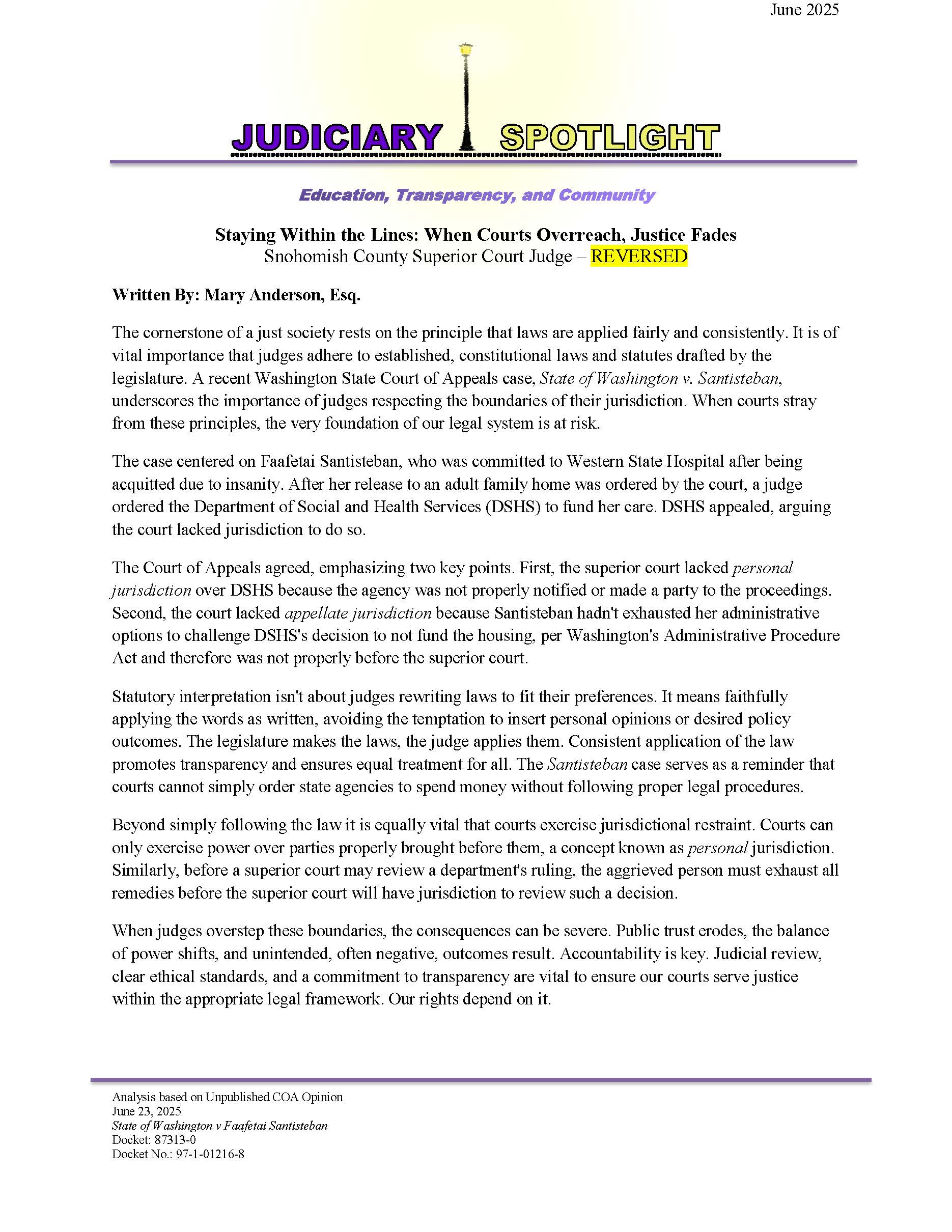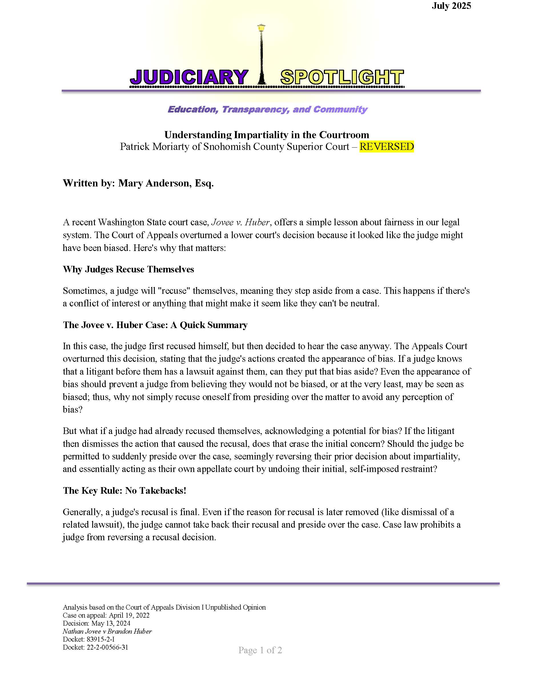 The Judiciary Spotlight column seeks to educate the community about the judicial system and bridge the gap between the public and the judiciary. By enhancing awareness of judicial rulings, we strive to illuminate the rationale behind judges’ decisions, especially in cases that have been reversed, while providing insight into the underlying legal principles. Our goal is to help the community grasp the context of these rulings and their implications for citizens. We aspire to foster a deeper understanding of the justice system and its impact on our lives through concise summaries and legal analysis.